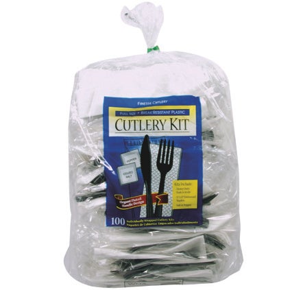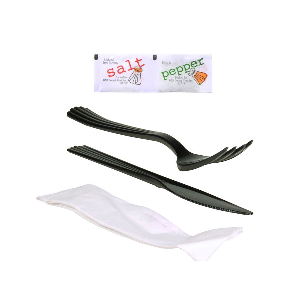 WNA Heavyweight Plastic Fork & Knife Cutlery Kits, Black, with Napkin/Salt/Pepper, Polypropylene, 100 Ct Bag, 4/Case