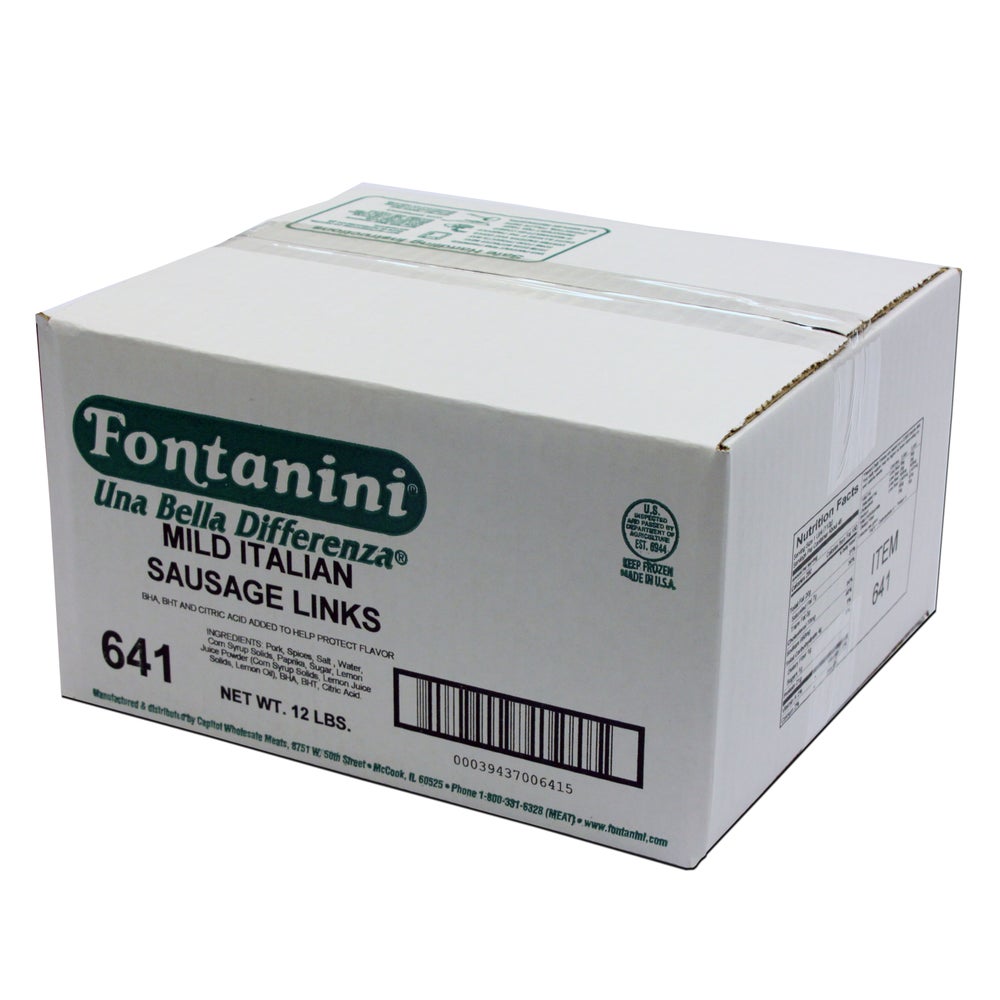 Fontanini Mild Italian Pork Sausage, 6 Inch, Links, Natural Casing, 4 Count Per Pound, Raw, Frozen, 4 Ounce, 12 Lb Package, 1/Case