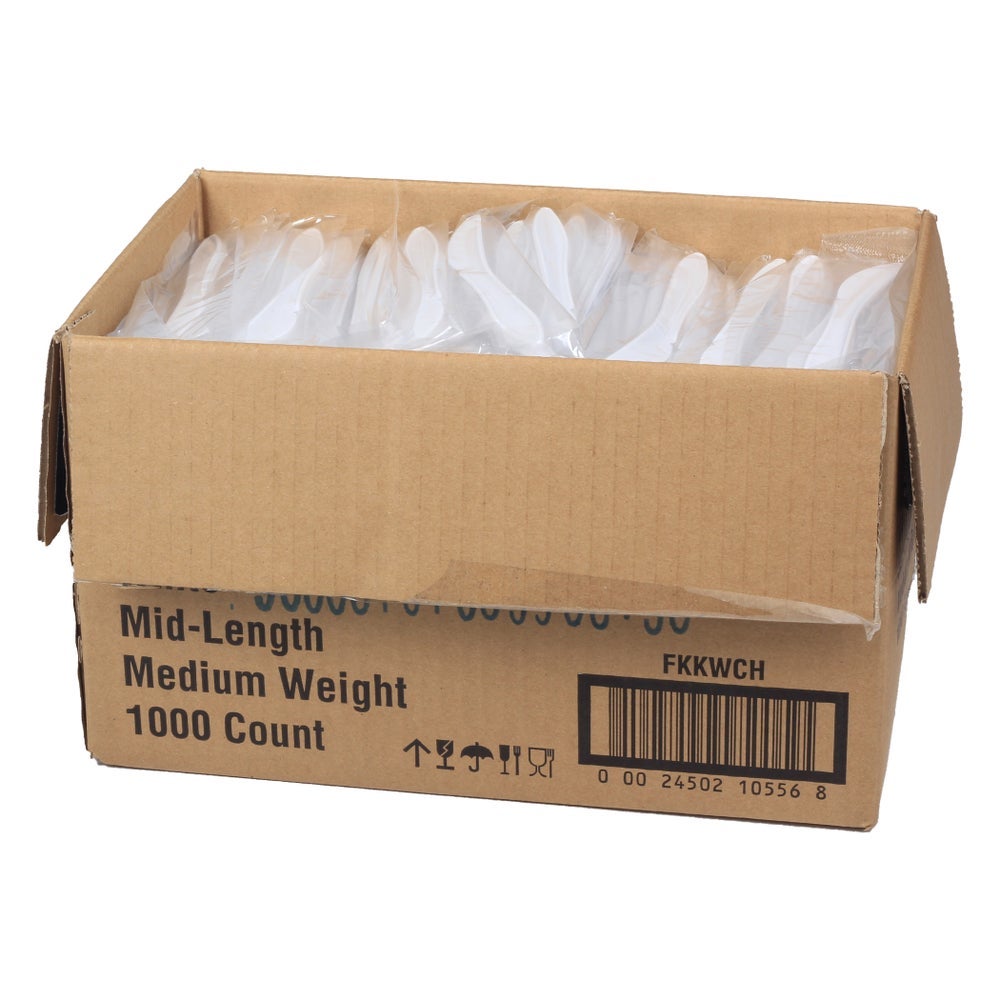 These disposable, individual white plastic knives are wrapped in a polypropylene bag for safety and convenience in foodservice, healthcare, hotel, and to-go programs.