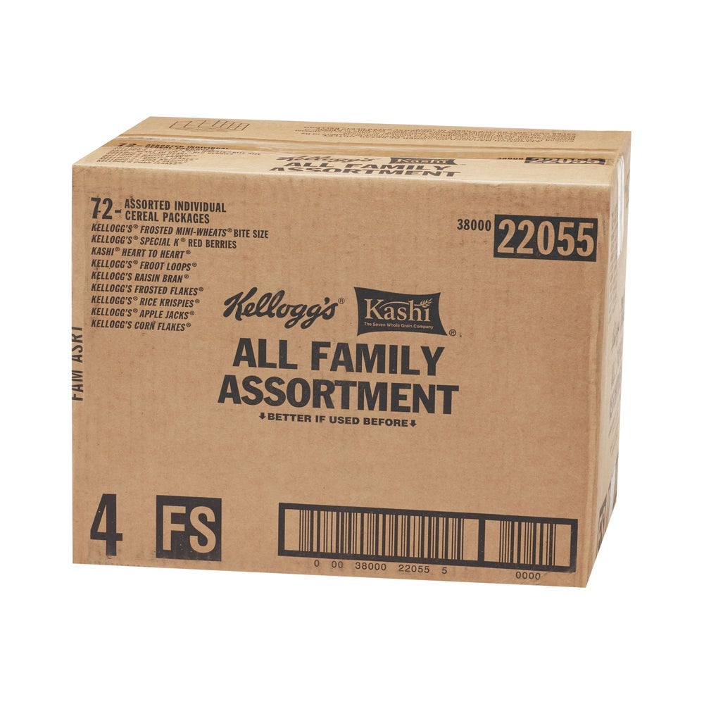 - 60 cereal cups, 2.1oz Kellogg's Frosted Flakes, 1.5oz Froot Loops, 2.8oz Raisin Bran Crunch, 1.5oz Apple Jacks, 1.5oz Corn Pops, 2.3oz Cocoa Krispies, 2.5oz Frosted Mini Wheats, 1.87oz Kellogg's Krave Chocolate. 20.563 IN x 11.750 IN x 13.625 IN. The case shows the BEST BY date in the format MMDDY.