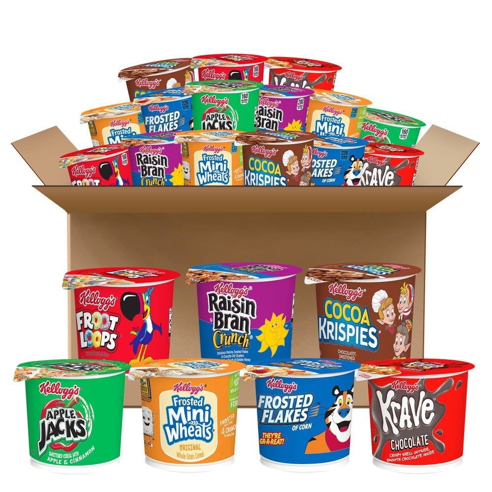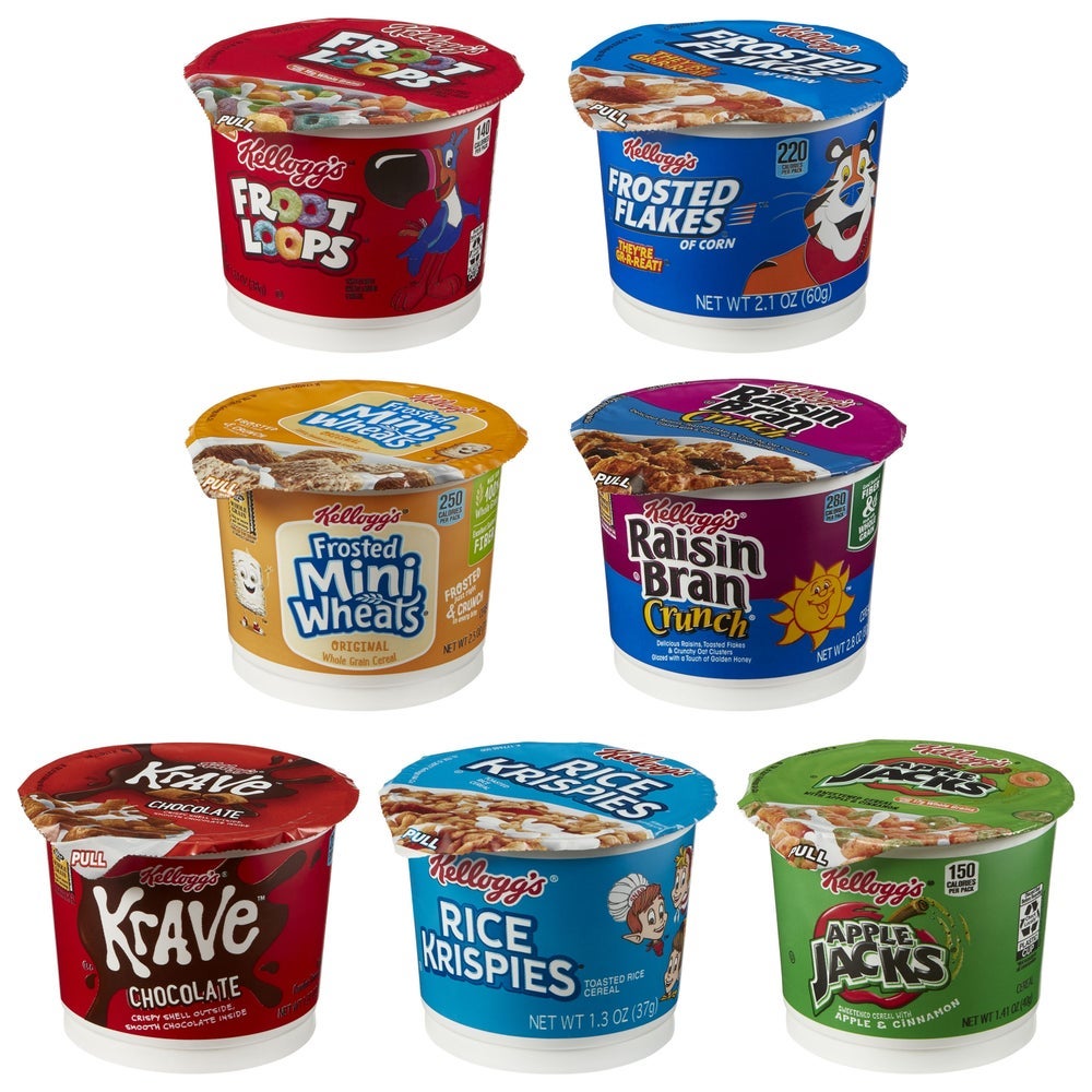 - The Total Assortment includes cups of Kelloggs Frosted Flakes, Kelloggs Froot Loops, Kelloggs Raisin Bran Crunch, Kelloggs Apple Jacks, Kelloggs Corn Pops, Kelloggs Cocoa Krispies, Kelloggs Frosted Mini Wheats, and Kelloggs Krave Chocolate.