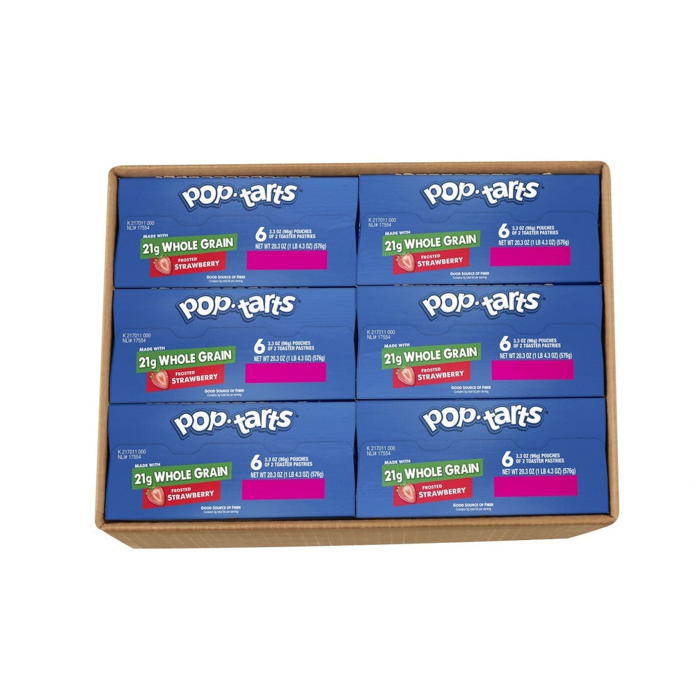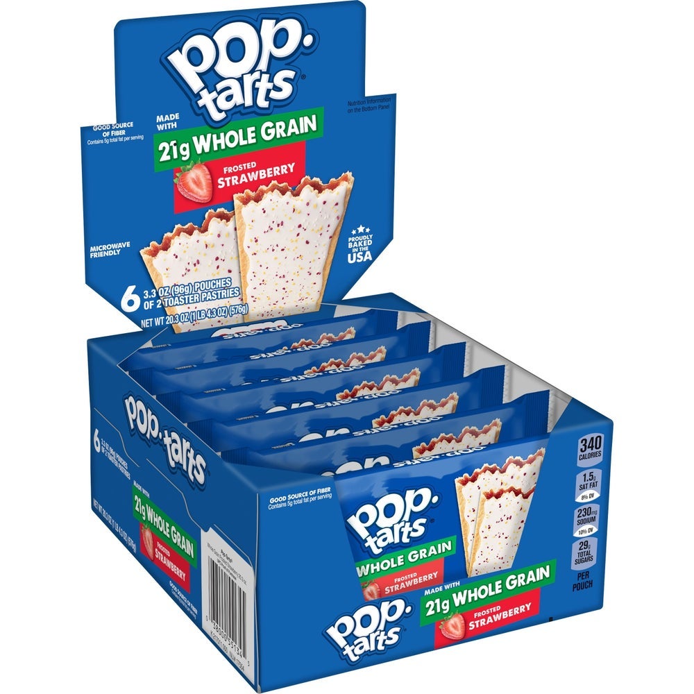 - Pop Tarts Made with Whole Grain Frosted Strawberry toaster pastries in two count pouches, packed in six count display trays. Jump start the day with a strawberry flavored filling encased in a pastry crust and topped with frosting and rainbow sprinkles
