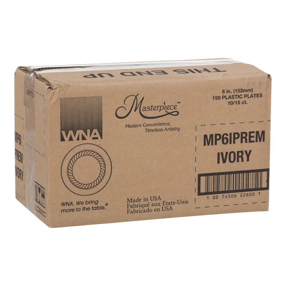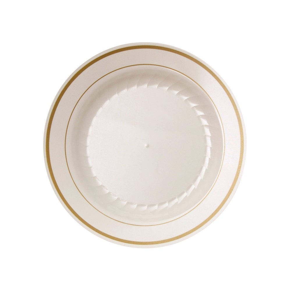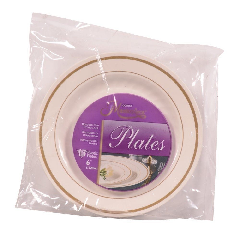 Masterpiece 6 Inch Plastic Plates, Ivory with Gold Trim, Polystyrene, 15 Ct Package, 10/Case