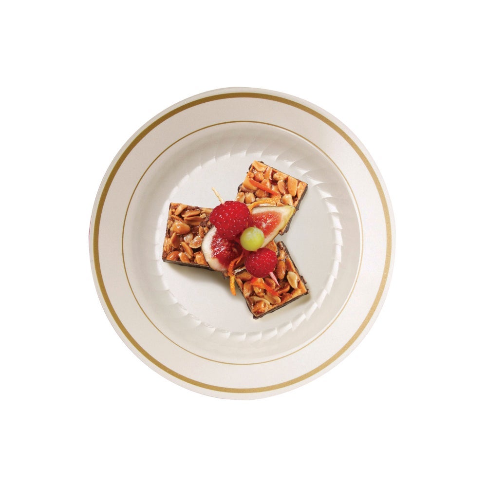 These ivory and gold plates offer an upscale, china-like presentation for a variety of applications.