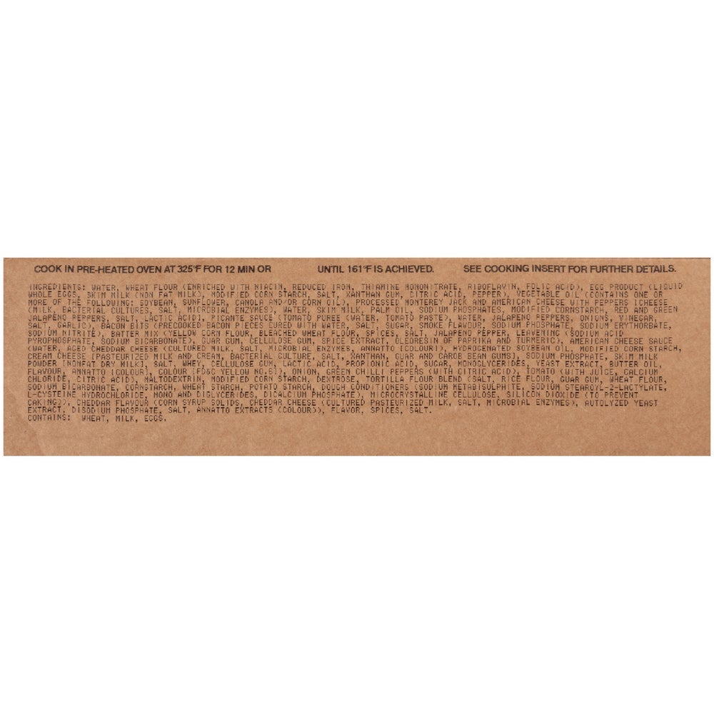 • Scrambled eggs, bacon, tomatoes, Monterey jack and American cheeses, jalapeno and picante sauce wrapped in a freshly baked battered flour tortilla. Product is then crispy fried