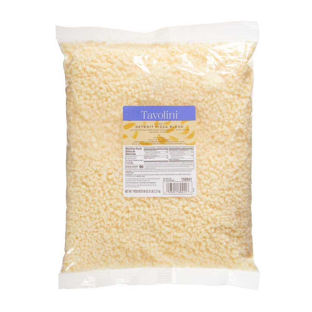 Tavolini Detroit Pizza Cheese Blend, 70% Low Moisture Part-Skim Mozzarella/30% Monterey Jack Blend, Diced, 5 Lb Bag, 4/Case