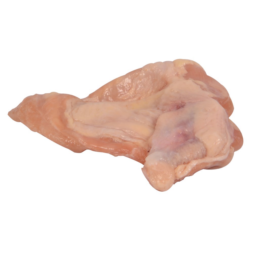 These boneless, skin-on, split airline chicken breasts feature the first wing joint attached.