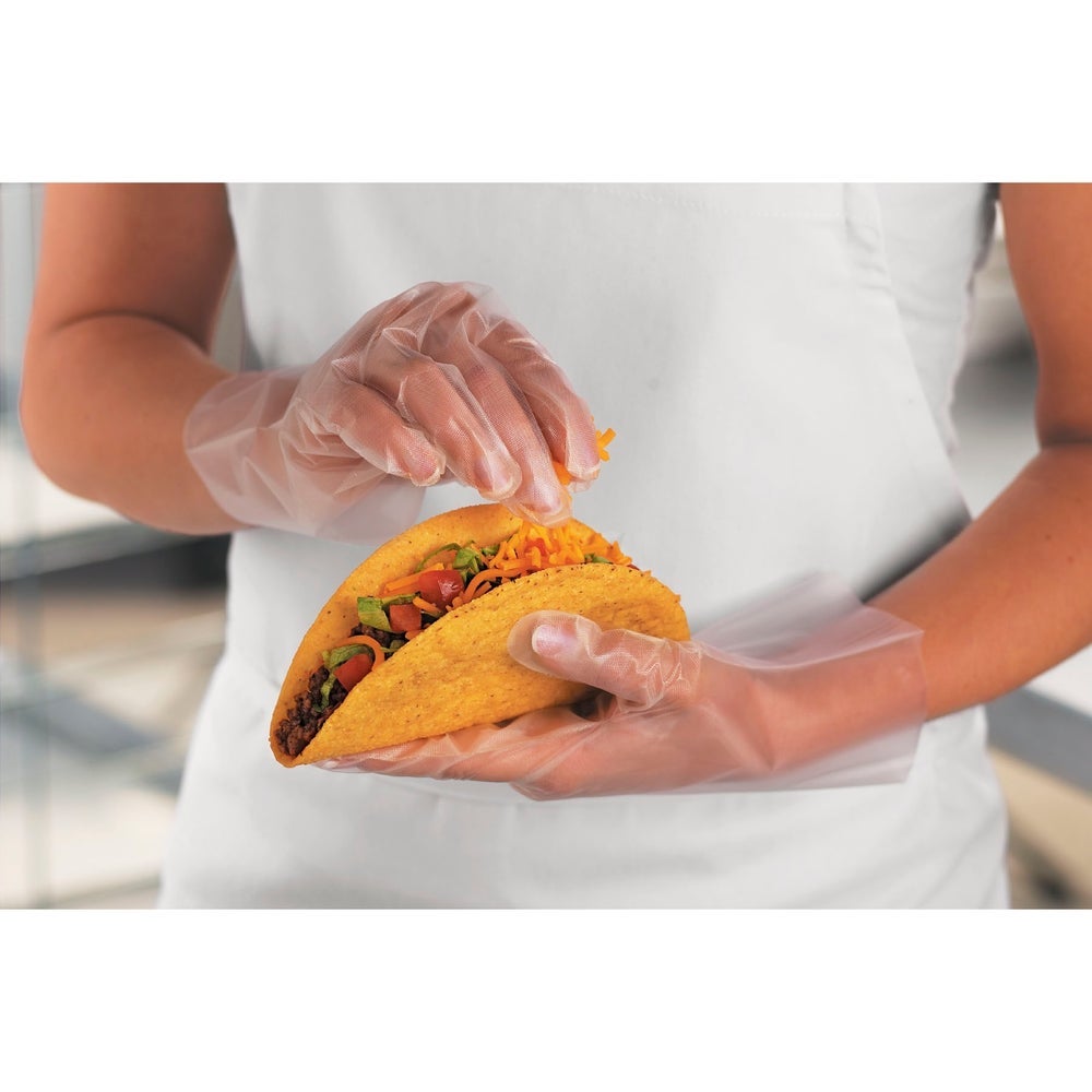 - Made from reliable quality poly material, these powder-free gloves provide a clear barrier between hands and ready-to-eat foods.