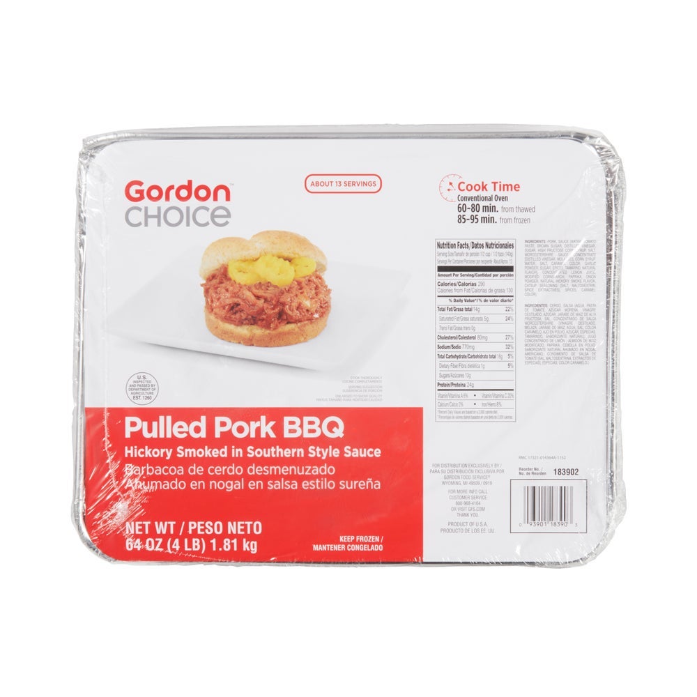 Gordon Choice Hickory-Smoked Pulled Pork Barbecue, with Southern-Style Sauce, Cooked, Frozen, 4 Lb Tray, 4/Case
