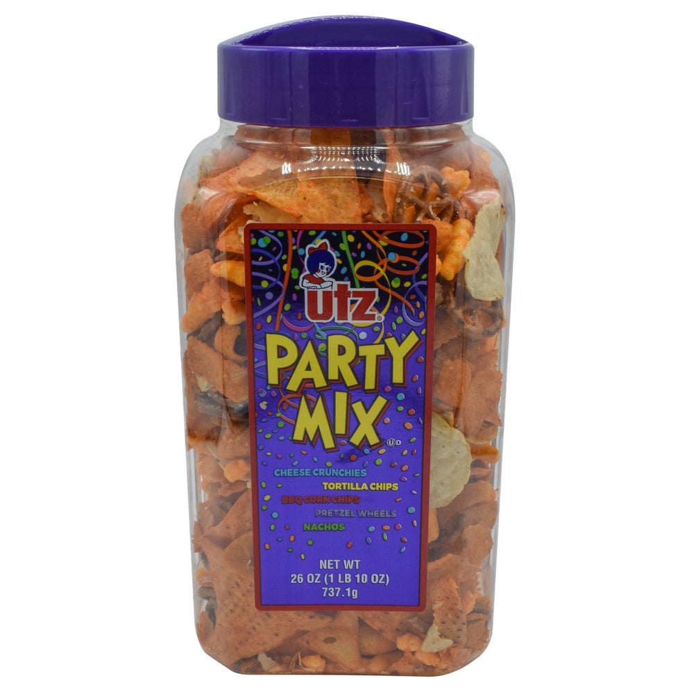 Utz Party Mix, Crunchy Curls, Tortilla Chips, BBQ Corn Chips, Pretzel Wheels, and Nachos, 26 Oz Jug, 6/Case