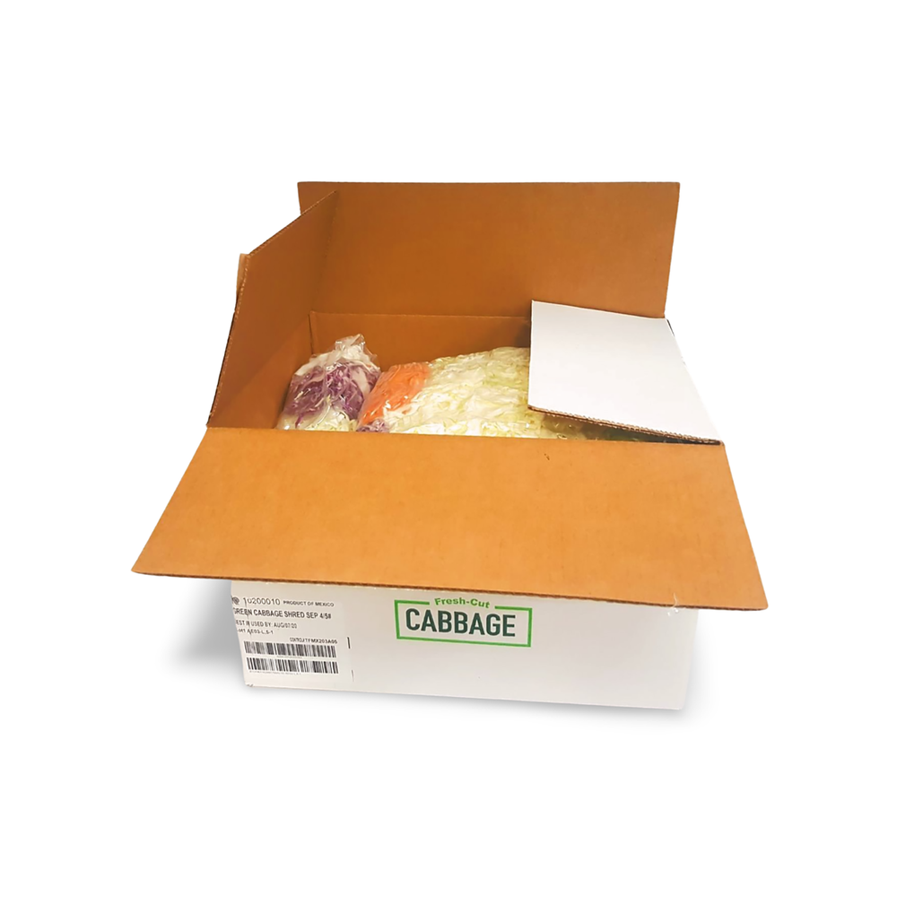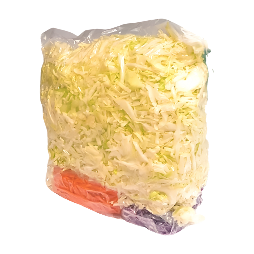 - Shredded extra-fine to 1/8 of an inch, this slaw consists of separately bagged shredded green cabbage, carrots and red cabbage so the amounts can be adjusted to preference.