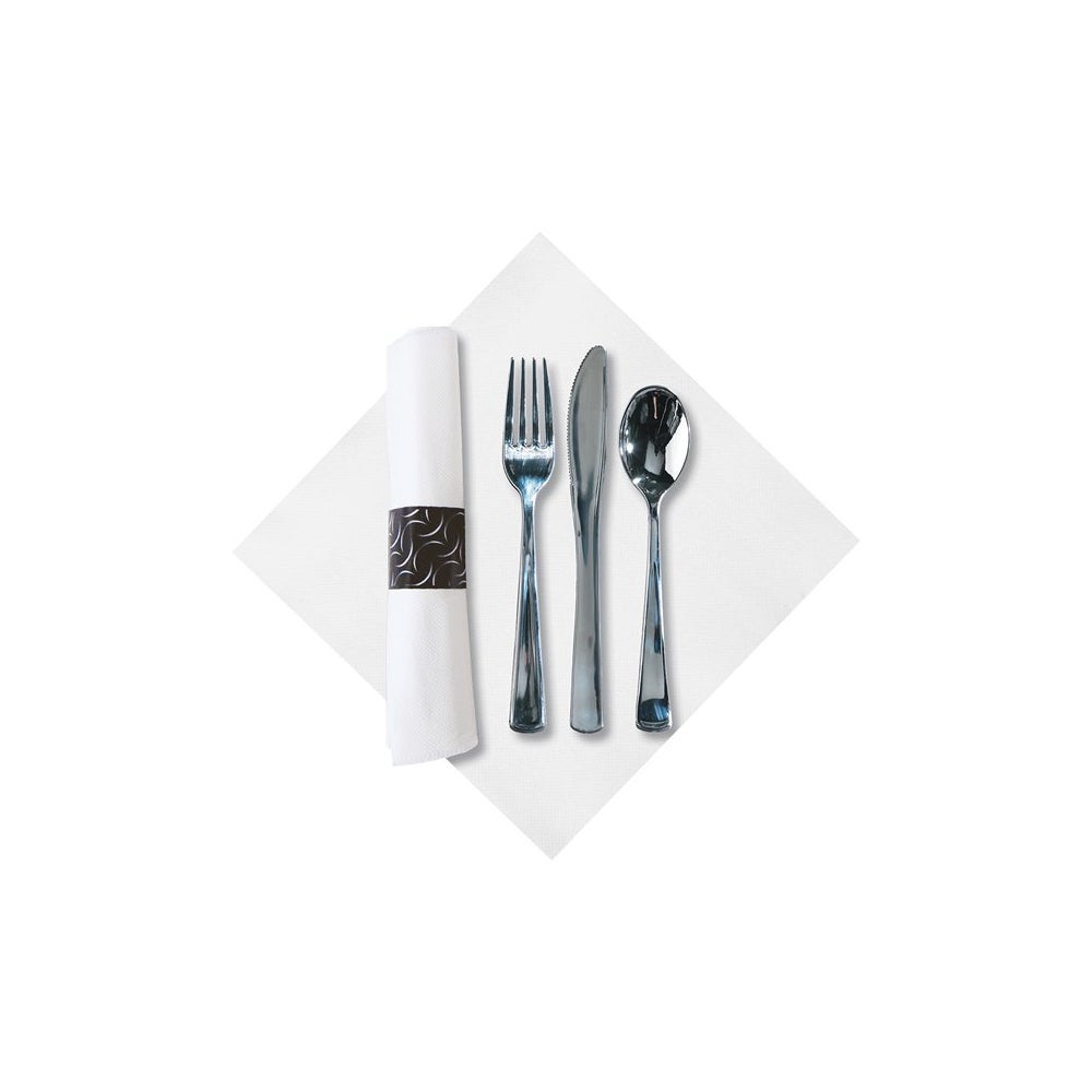 These bagged CaterWrap cutlery sets include a dinner napkin rolled around a set of heavyweight metallic cutlery.