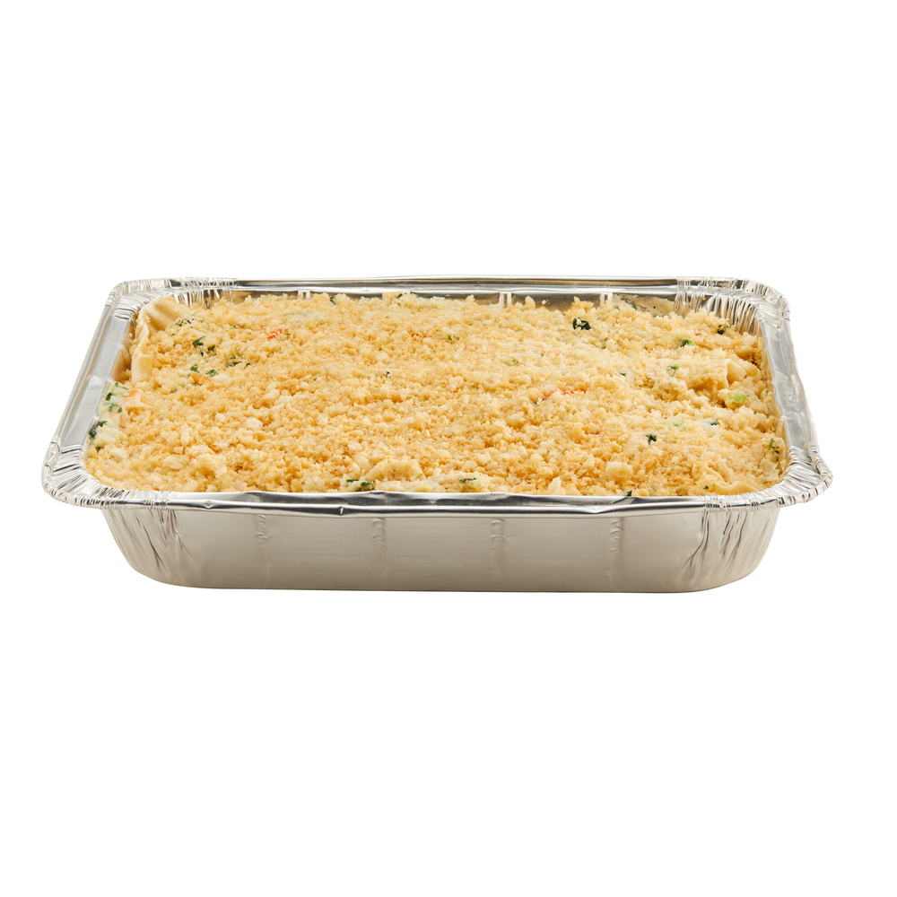 Ruffled pasta, spinach, broccoli, and shoestring carrots are combined in a rich blend of ricotta, mozzarella, Romano, Asiago, and Parmesan cheeses. The lasagna has a hint of garlic, accented with onions, and is topped with golden breadcrumbs.