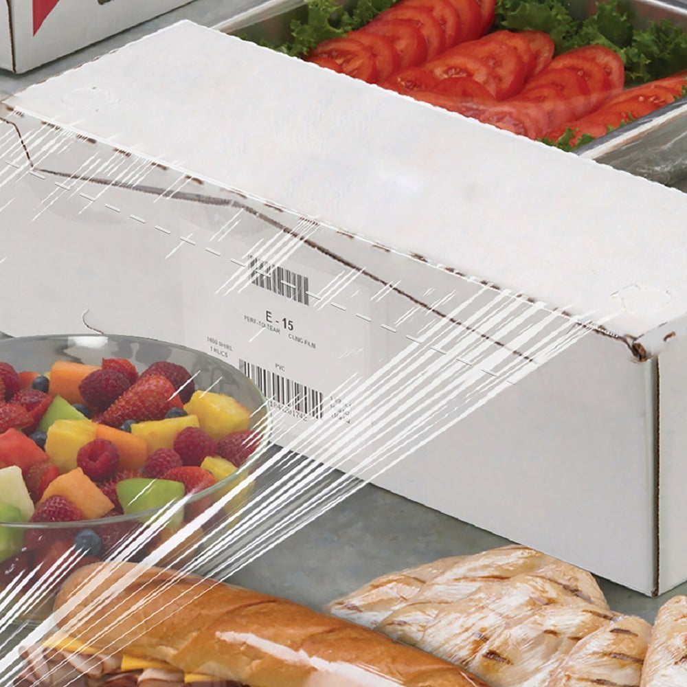 This versatile, perforated cling wrap can be used to secure a variety of food items to china, glass, plastic, and stainless steel dishes.
