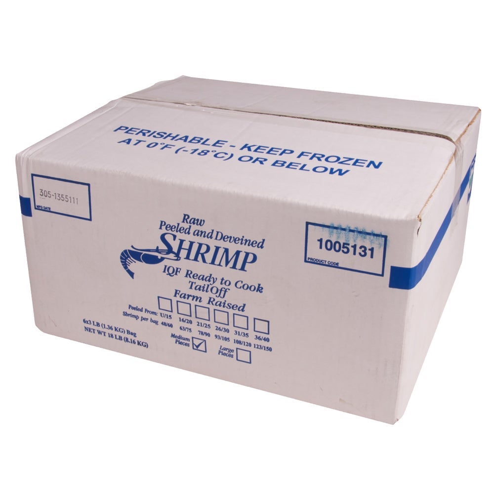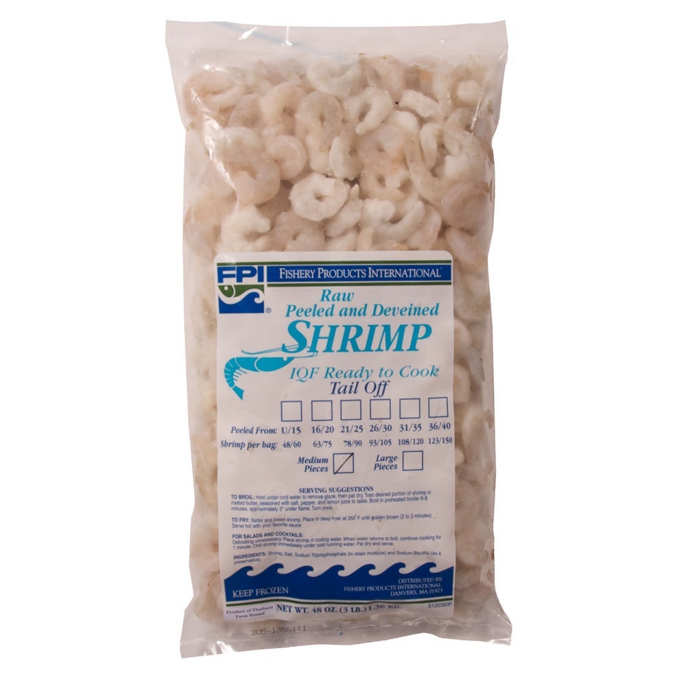 Medium-sized, tail-off shrimp pieces have been peeled and deveined to provide a fresh seafood taste for a variety of applications, such as soups, casseroles, and stuffings.