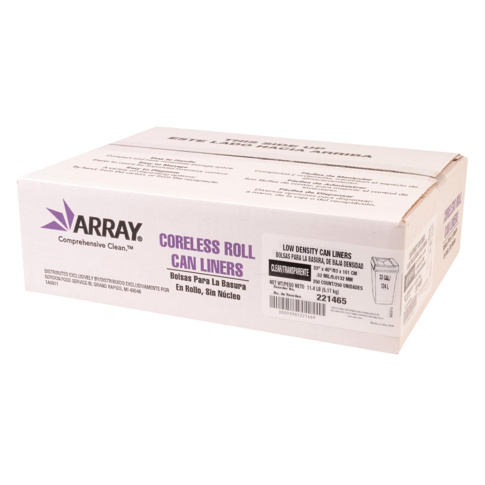 Array 33 Gallon Clear Can Liners, Low Density, 0.52 Mil, 33 x 40 Inches, 50 Ct Roll, 5/Case