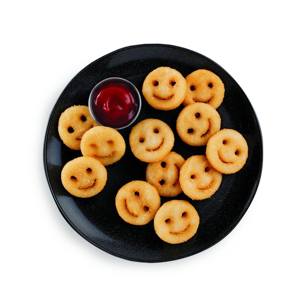 Smile-shaped mashed potatoes have a crispy outside and creamy mashed potato inside for a taste and texture that appeals to kids.