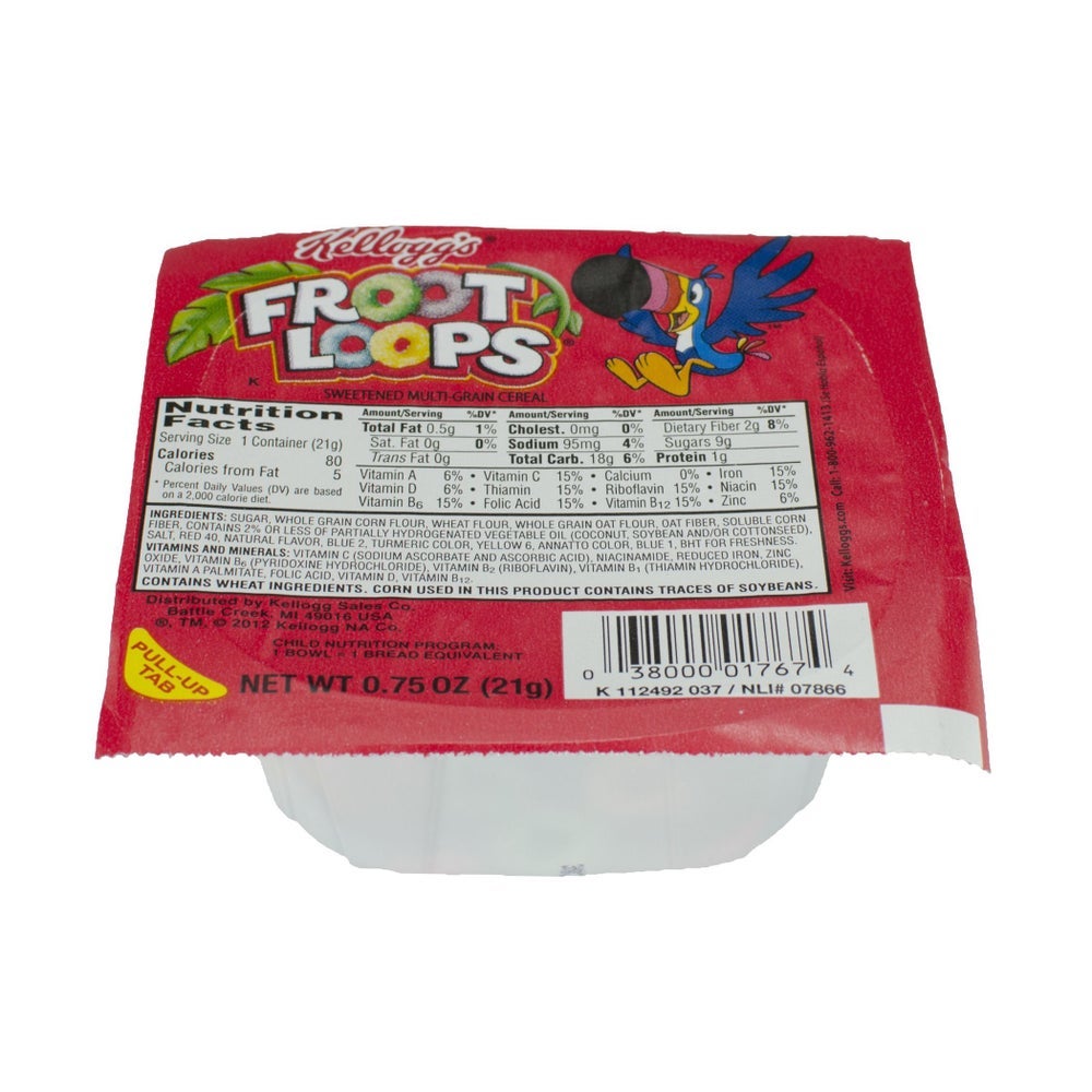 Kelloggs Froot Loops Breakfast Cereal is colorful, fun, and offers bold fruity flavor like no other cereal can. These convenient, no prep required cups offer a healthy, sweet, and crispy snack any time. Enjoy in the morning, noon, or night.
