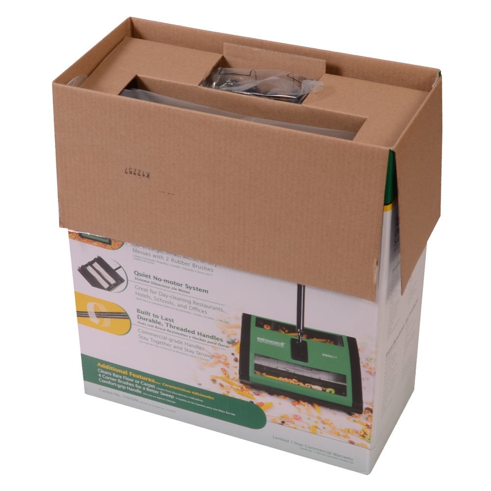 This commercial carpet sweeper features two rows of rubber blades which enable it to be used on wet or dry debris, while the soft rubber wheels conform to a variety of floor surfaces. Ideal for use in food consumption areas and on low pile carpet and bare floors.