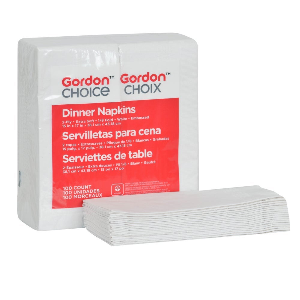 Gordon Choice 2-Ply Embossed Dinner Napkins, White, 1/8 Fold, 15 x 17 Inch, Poly-Packed, 100 Ct Package, 28/Case