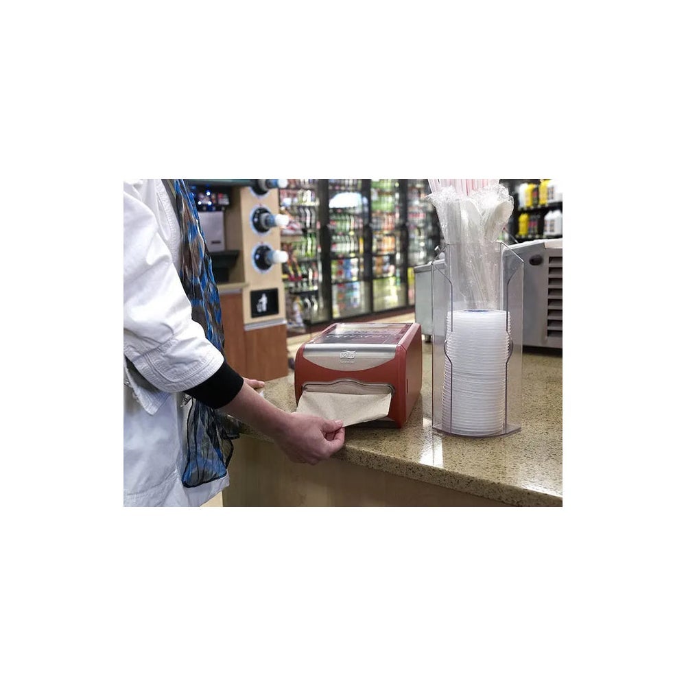 Tork Xpressnap Natural Dispenser Napkin N4: Strengthen your quick-service restaurant with a system that will help you improve hygiene and reduce your napkin consumption by 25% compared to traditional napkin dispensers. Our well-enclosed dispenser protects napkins so guests only touch what they take, improving cleanliness. The pack solution provides extra reassurance since the napkins are covered by paper packaging during transport and storage.