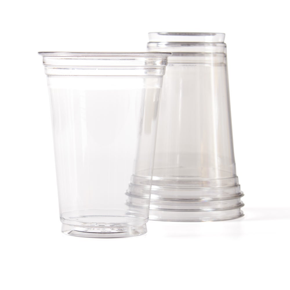 - These recycled PET cups are made with 25% post consumer recycled plastic bottles, which helps reduce landfill waste. These 20 ounce cups are strong and durable and the clarity beautifully displays your signature beverages.