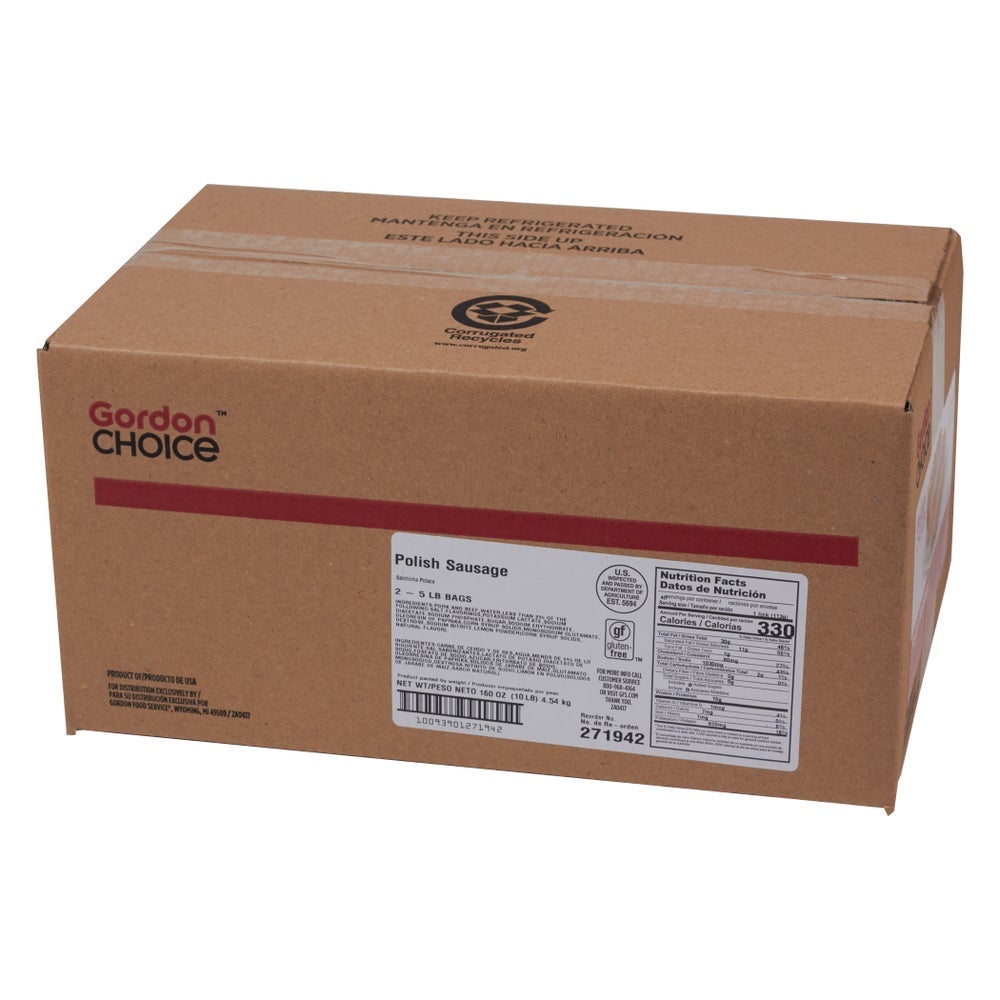 Gordon Choice Smoked Polish Beef & Pork Sausage, 6-3/4 Inch, Links, 4 Count Per Pound, Cooked, Frozen, 5 Lb Bag, 2/Case