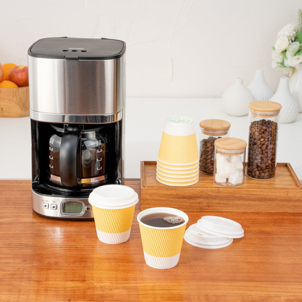 Enjoy cappuccinos or lattes with style using our Restpresso 8-ounce Light Yellow Paper Ripple Wall Coffee Cups. These 8-ounce coffee cups include white lids, allowing you to create a leakproof seal to eliminate spills while enjoying beverages on the way to work or school. Plus, these white lids feature an elevated spout which provides you with a comfortable way to enjoy teas or coffees. Equipped with superior insulation, these disposable coffee cups with lids keep hot drinks warmer for longer to ensure you enjoy every sip. Featuring a light yellow finish, these disposable tea cups with lids add a charming touch to beverages served at your family gathering or birthday party to make them picture-worthy. With a "recycle me" on the bottom of each cup, these paper hot cups with lids encourage your friends and family to recycle them after finishing their drinks.