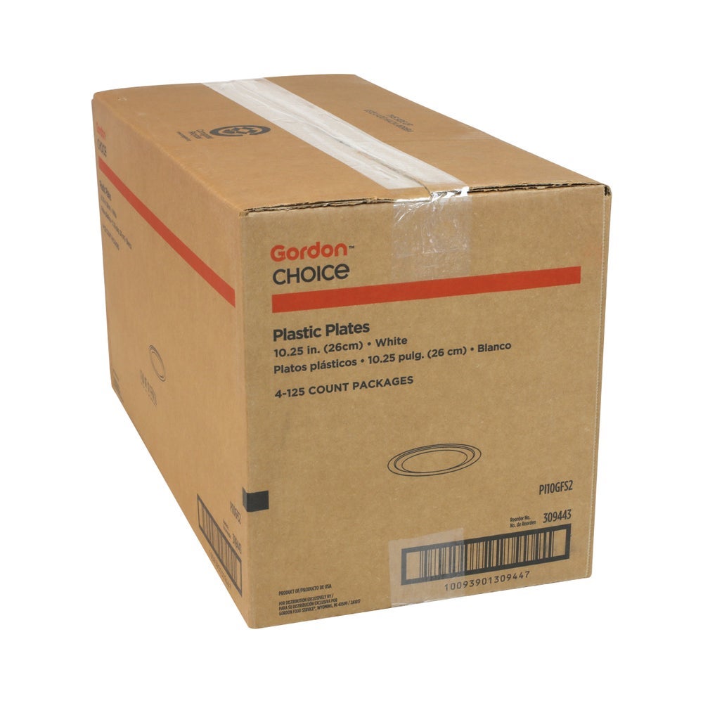 Gordon Choice 10.25 Inch Plastic Plates, White, Polystyrene, 125 Ct Package, 4/Case