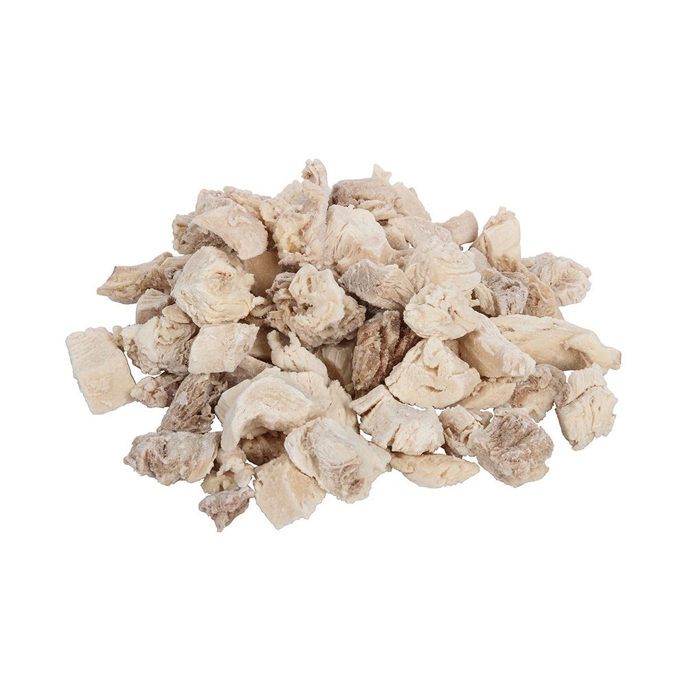 - This convenient blend of 60% white meat and 60% dark meat chicken has been fully cooked and diced into 1/2-inch portions for use in a variety of dishes. Each case contains two, five-pound bags.