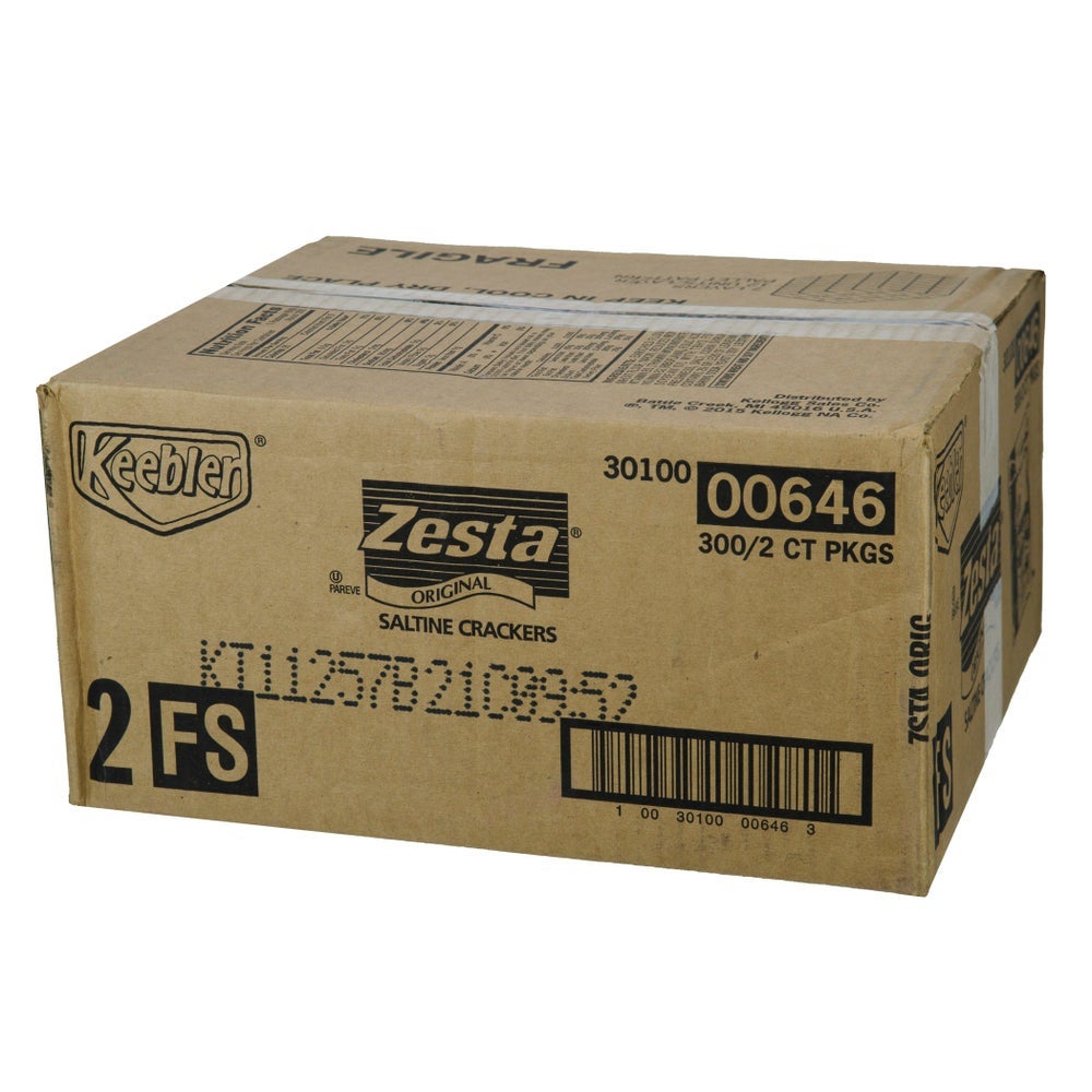 Enjoy tried and true Kellogg's Zesta Original Saltine Crackers for a crispy, crunchy, and slightly toasty bite every time. This bulk case of Zesta Saltines is crafted with a classic recipe of enriched wheat flour, baking soda, yeast, salt and other tasty ingredients. Each batch is oven-baked to create the delicate crispiness that makes Zesta an ideal foodservice staple. They're cholesterol free (0g monounsaturated fat, 0.5g polyunsaturated fat), with 1.5g total fat per serving and 0g trans fat; Saltine crackers are great for anytime snacking and pair deliciously with dips and savory toppings. They also go great with soup, stew, chili, and salad, and make a satisfying part of any lunch, dinner or late-night meal. Serve for Kellogg's Zesta Saltine Crackers for the original taste and texture customers know and love.
