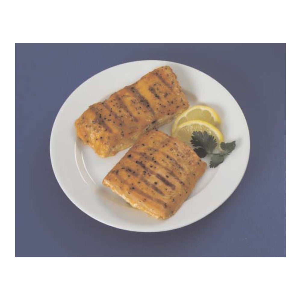 These boneless, skinless fillets are center-cut to maintain a rectangular or square appearance. Glazed with a citrus pepper glaze, these keta salmon fillets offer a firm texture and pale pink color accented with seared grill marks for a pleasing plate presentation. Each portion weighs 4 ounces average.