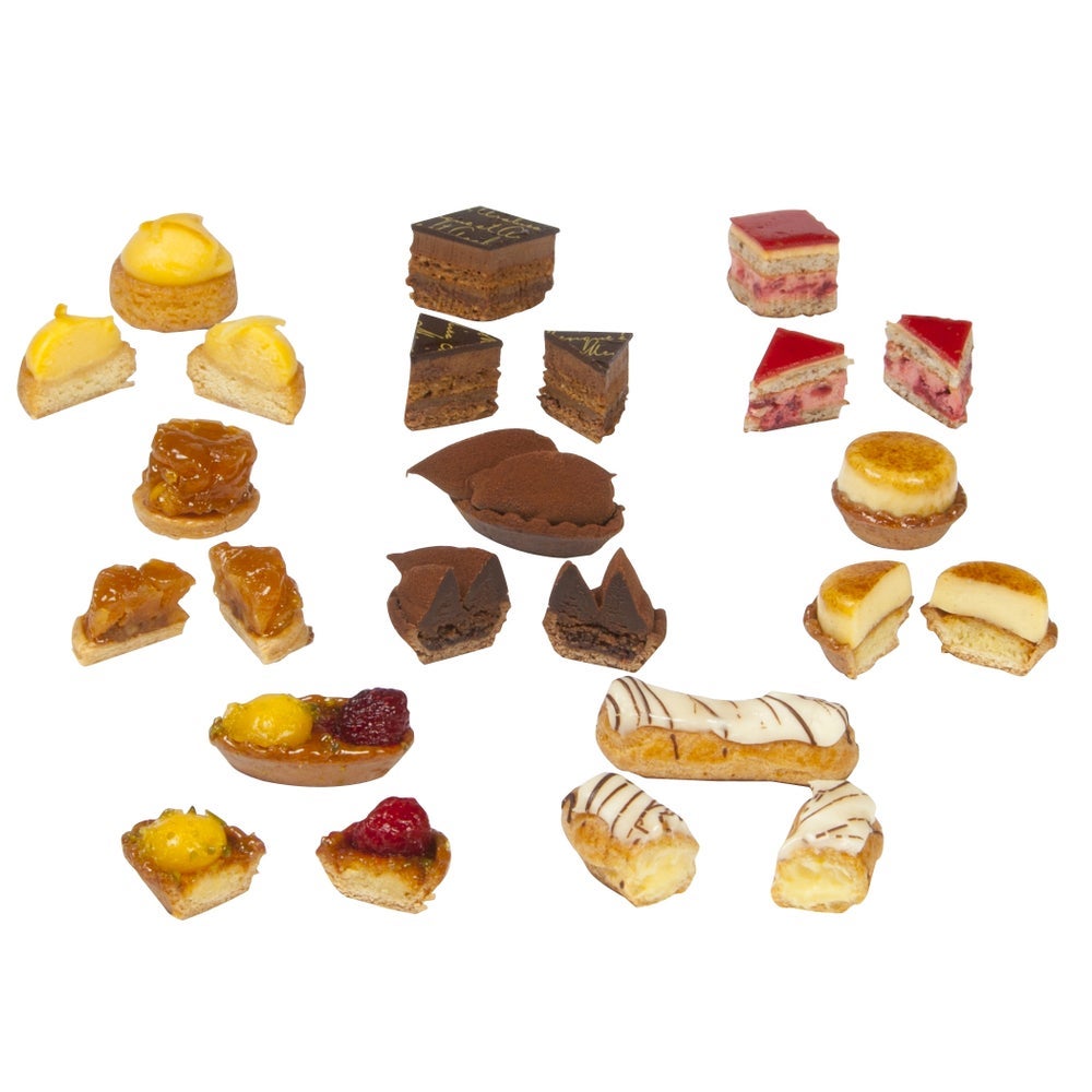 This selection of 8 petit fours provides a cross section of flavors, textures, shapes and colors. The flavors included are creme brulee, lemon cream shortbread, Sao Tome chocolate barquette, apple tart tatin, Grand Marnier salambo, crunchy chocolate coffee diamond, raspberry passion fruit barquette, and berry dacquois.