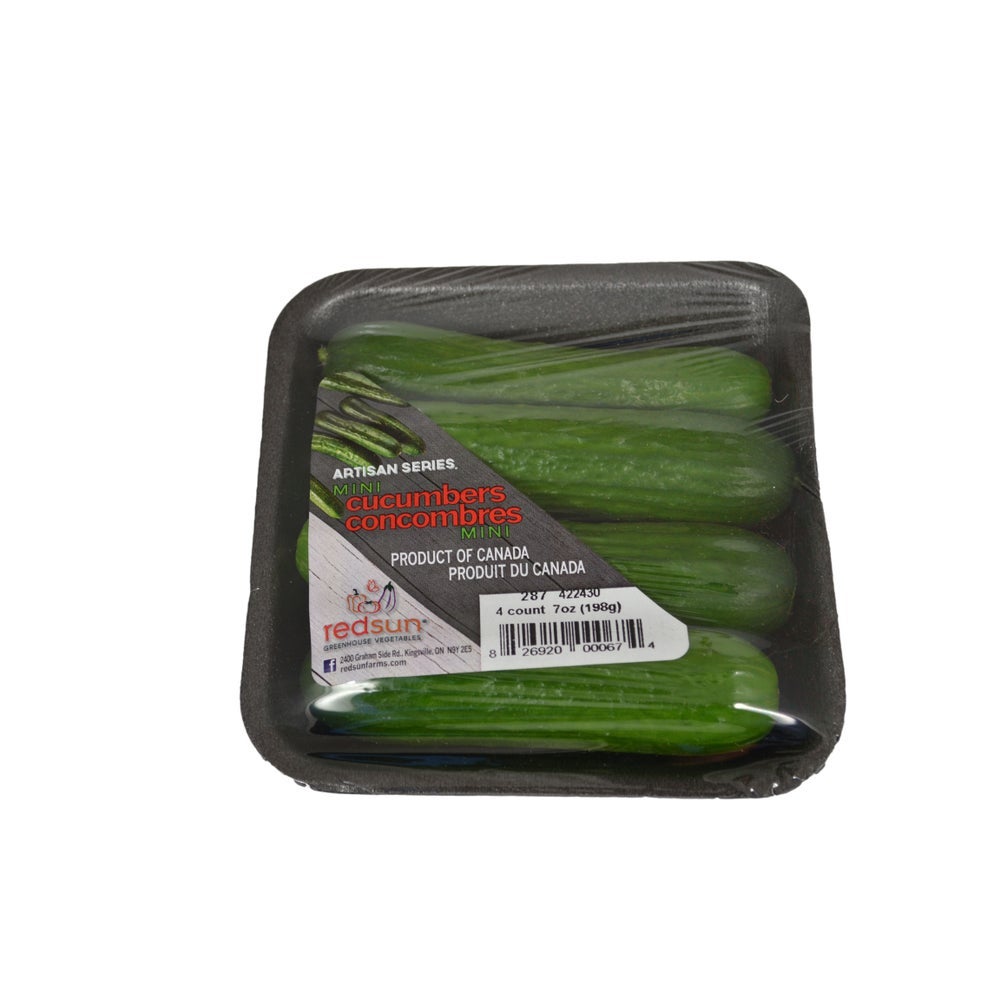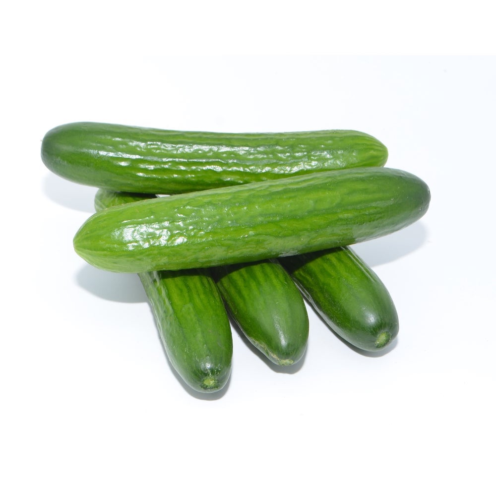 - Crisp and juicy, these mini, seedless cucumbers are field grown, and boast a plump shape, slightly tapered ends and smooth skin with an even, dark-green color. Brand may vary.