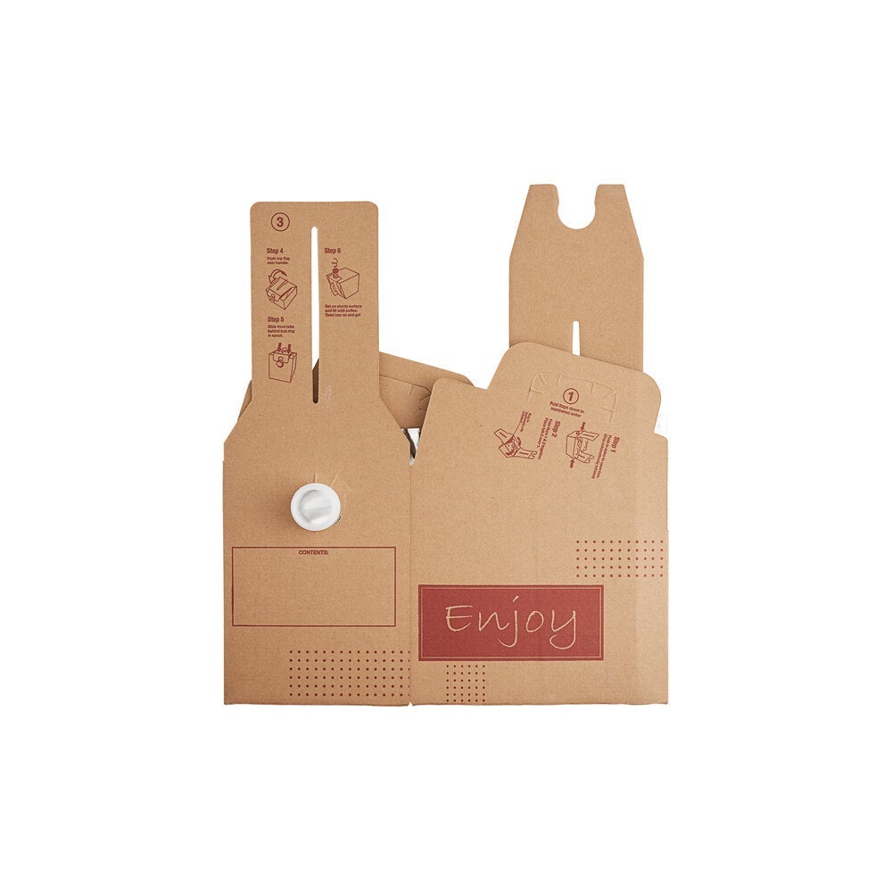These beverage containers feature a sturdy cardboard handle which makes it ideal for on-the-go use. Each container offers an inner bag which automatically inflate for quick and continuous filling while ensuring sanitation by eliminating the need to touch contents.