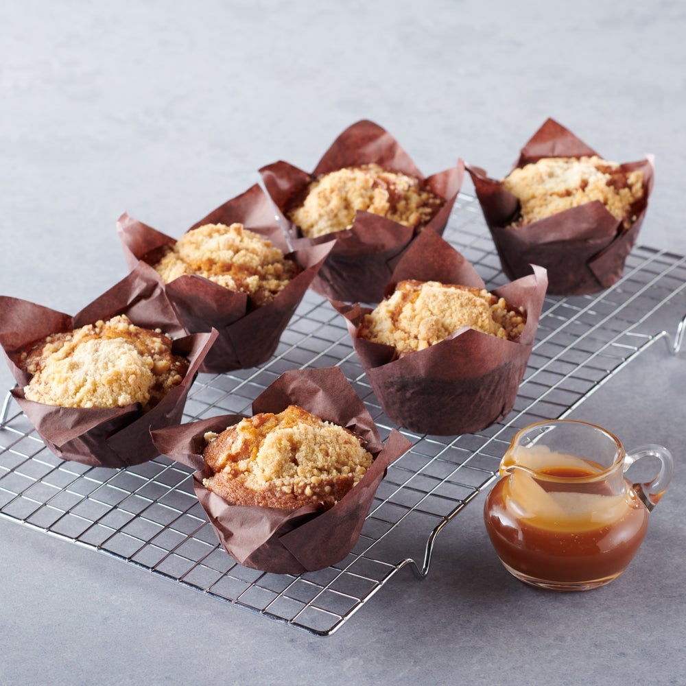 - Baked in a tulip-style cup for a fresh-from-the-bakery appearance, these sumptuous muffins are filled with real apple morsels, cinnamon and salted caramel, then finished with a delightful crumb topping.