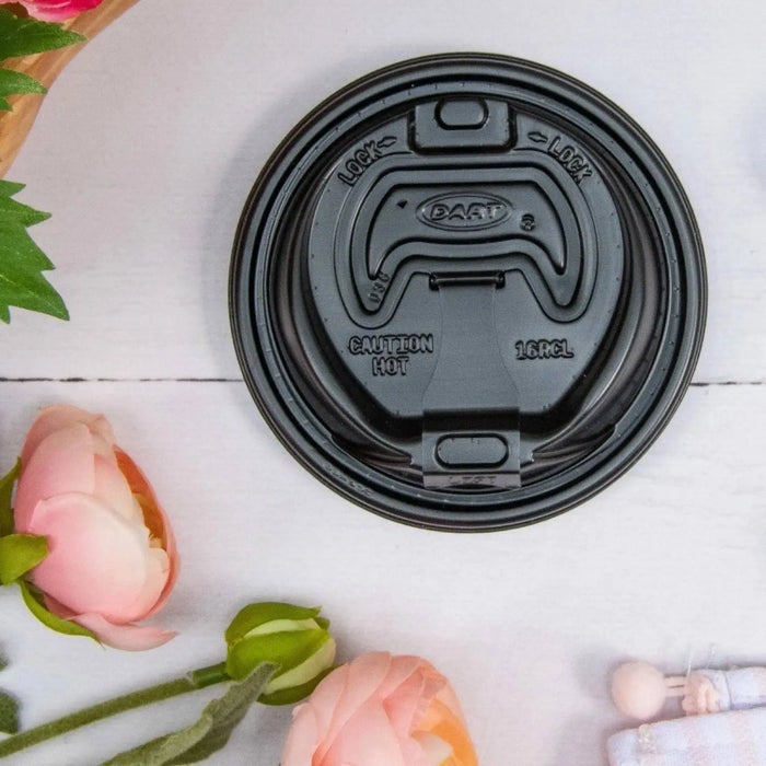 These black lids have an upscale appearance and are reclosable for a leak-resistant fit.
