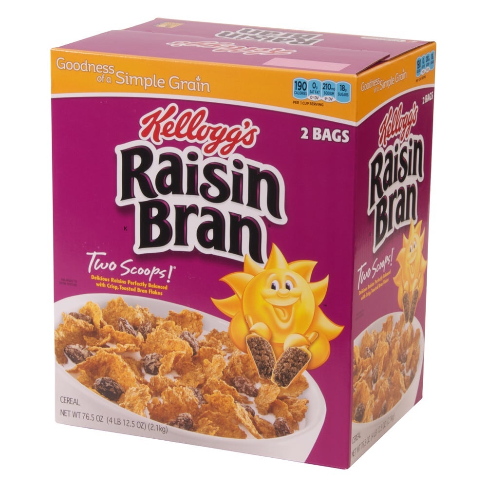 Kellogg's Raisin Bran is a combination of crispy wheat bran flakes and plump juicy raisins, and is a source of fiber and fortified with essential vitamins and minerals.