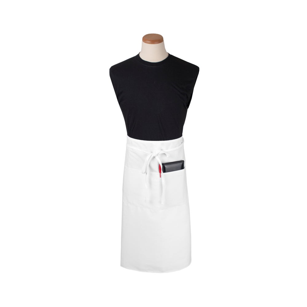 This poly-cotton blend bistro apron provides a professional look with the added convenience of two middle pockets and extra long self-ties.
