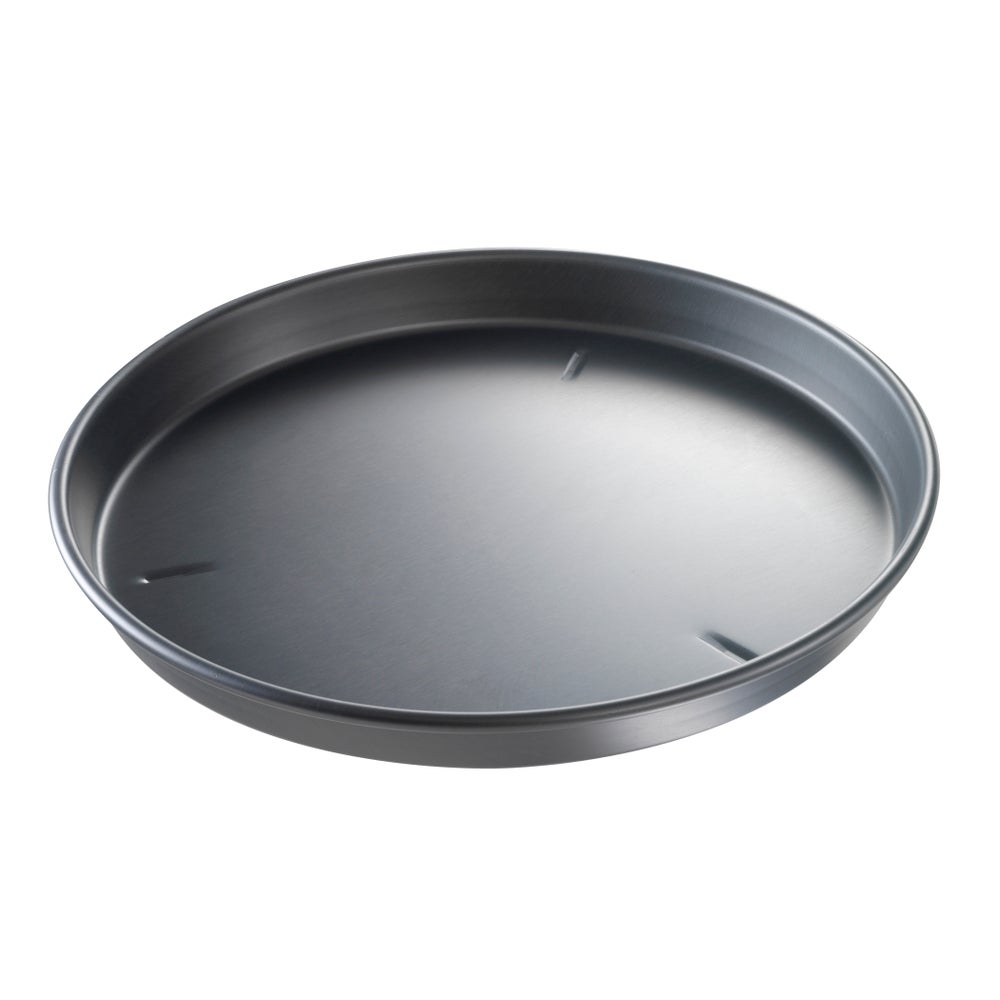 This anodized aluminum pizza pan allows for fast bake times at lower temperatures, while the hard-coat surface resists chipping, peeling, or rusting. Must be properly seasoned before use.