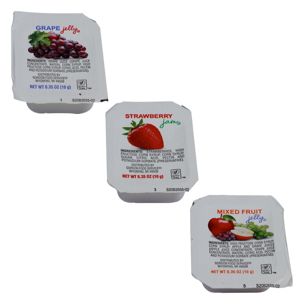 - This assortment of single-serve jelly cups includes 80 grape jelly, 80 mixed fruit and 40 strawberry tabletop packages.