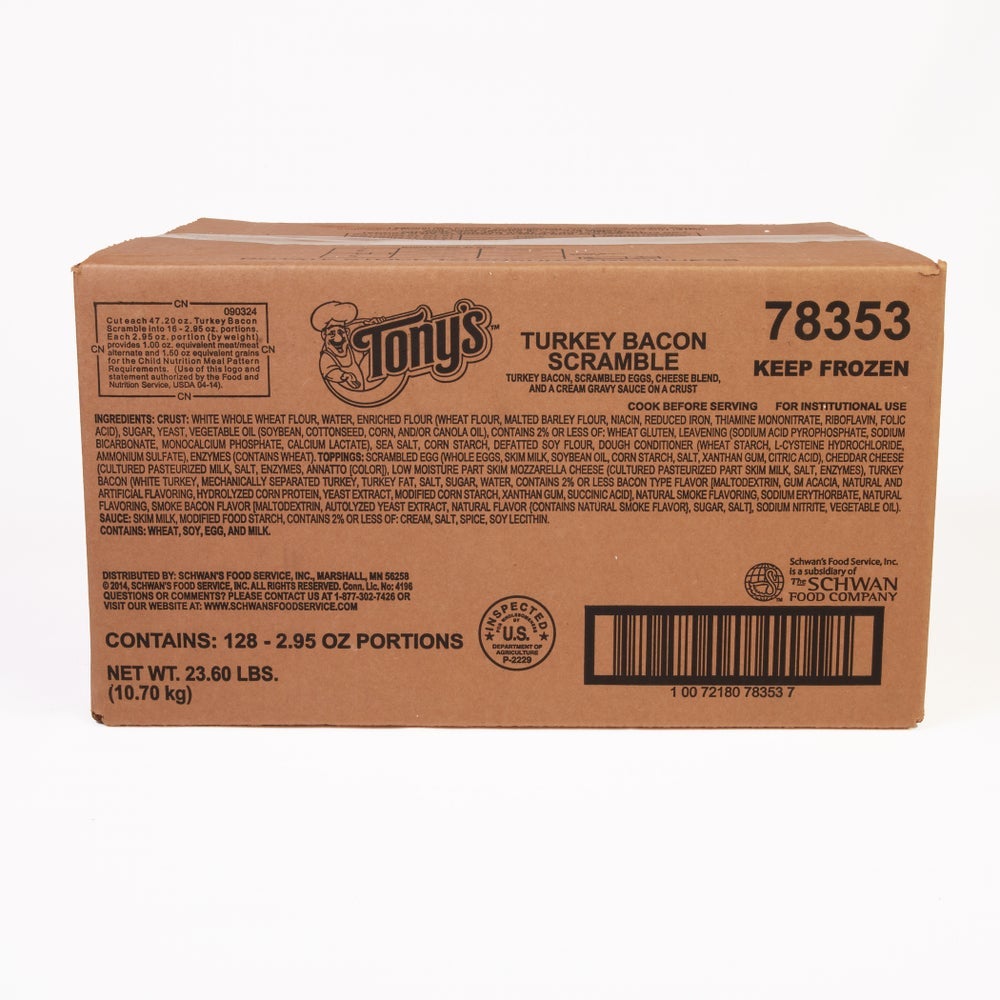 Topped with reduced fat cheese, turkey bacon, and eggs, these hearty breakfast squares are made with a 51 percent whole grain crust which easily breaks apart into 16 individual portions.