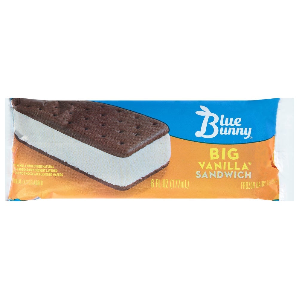 Blue Bunny Big Vanilla Ice Cream Sandwiches, Frozen, Individually Wrapped, 6 Fluid Ounce, 1 Ct Package, 24/Case