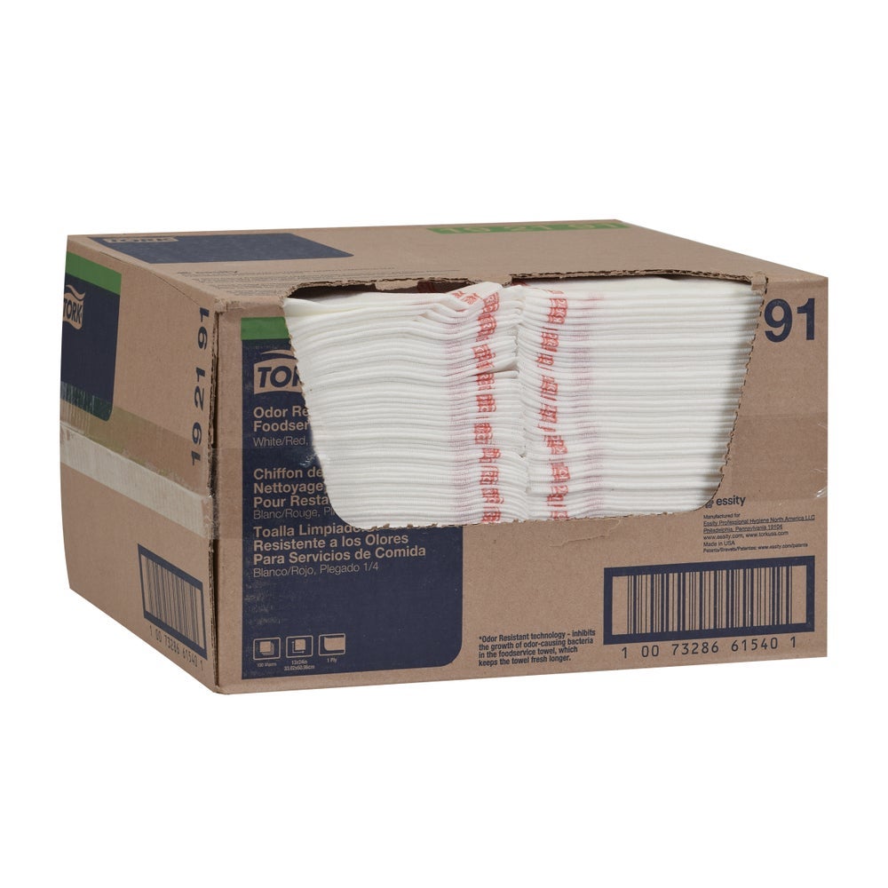 Tork Antimicrobial Foodservice Wipers, White with Red Stripe, 13 x 24 Inch, Self-Dispensing Box, 150 Ct Package, 1/Case