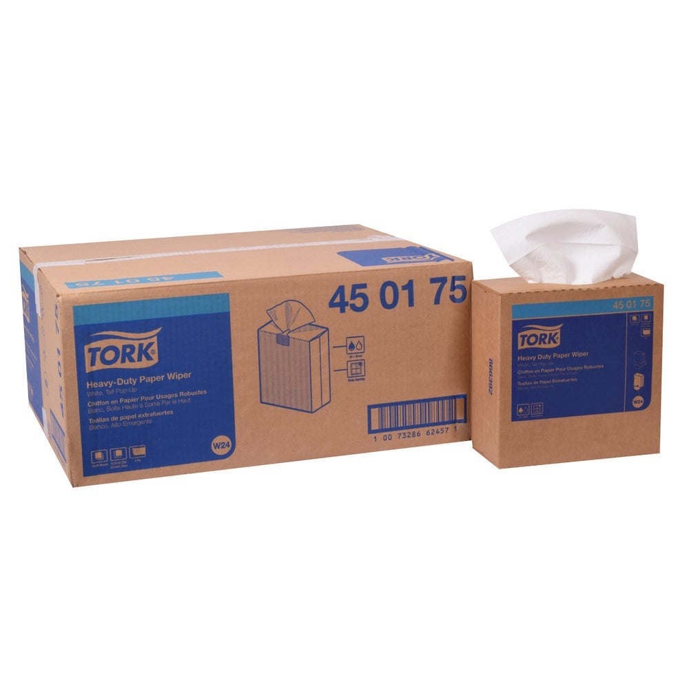 Tork Heavy Duty Paper Wiper White W24: Traditional paper towels aren't as versatile as our toughest, reusable wipers which are hard on surfaces but soft on skin. Standard shop towels are not as heavy as these high-absorbency wipes ideal for removing oil, grease, lubricants, and dirt. While paper towels dissolve when wet, these high-durability towels can be used with water again and again. The convenient carry box makes these cloths easy ideal for jobs on the go while keeping them protected.