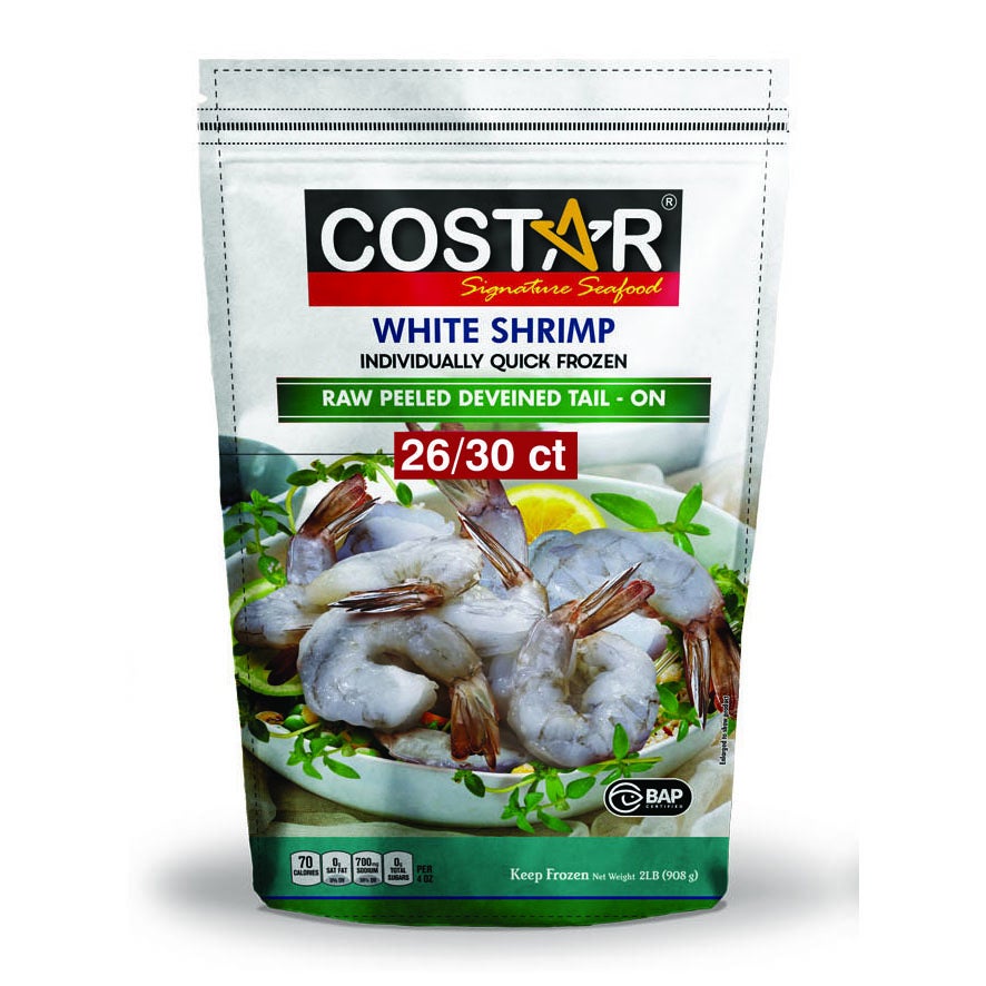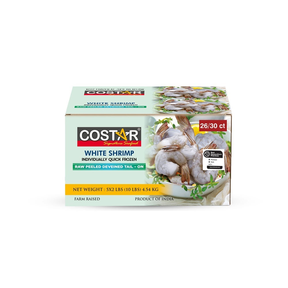 Costar White Shrimp, Peeled & Deveined Tail-On, 26-30 Count per Pound, Raw, Frozen, 2 Lb Bag, 5/Case