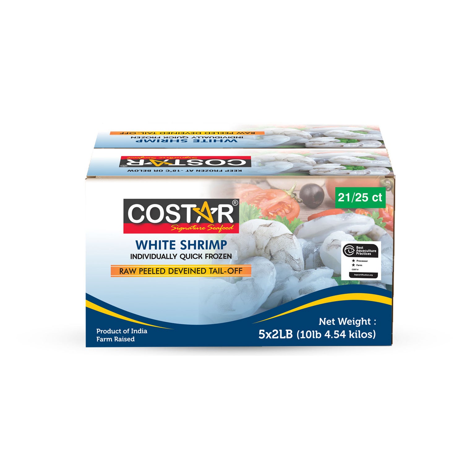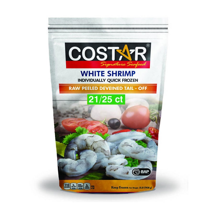 Costar White Shrimp, Peeled & Deveined Tail-Off, 21-25 Count per Pound, Raw, Frozen, 2 Lb Bag, 5/Case