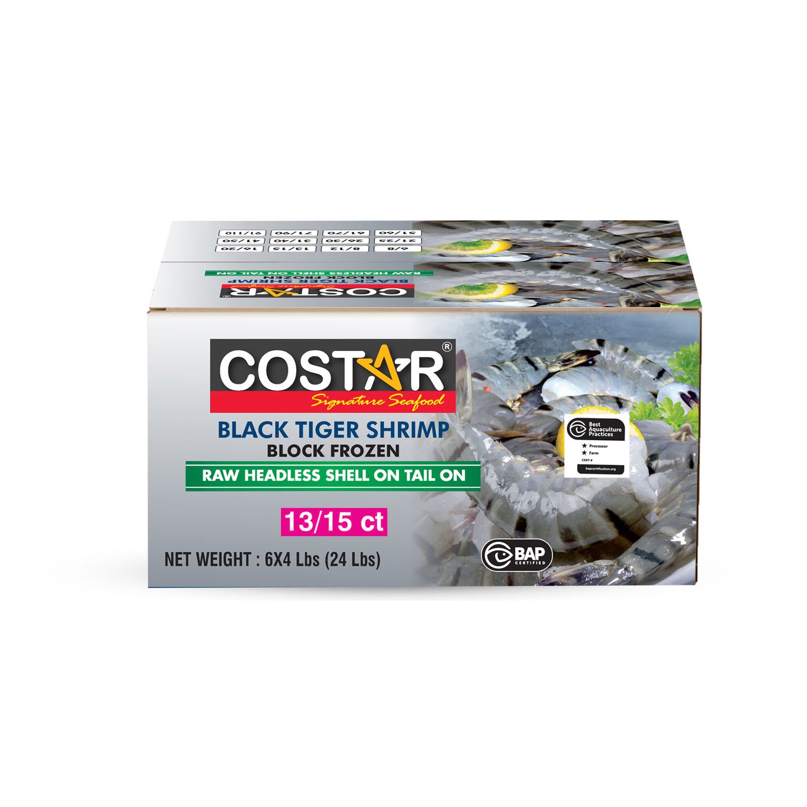 Costar Tiger Shrimp, Shell-On, Headless, 13-15 Count per Pound, Raw, Frozen, 4 Lb Box, 6/Case