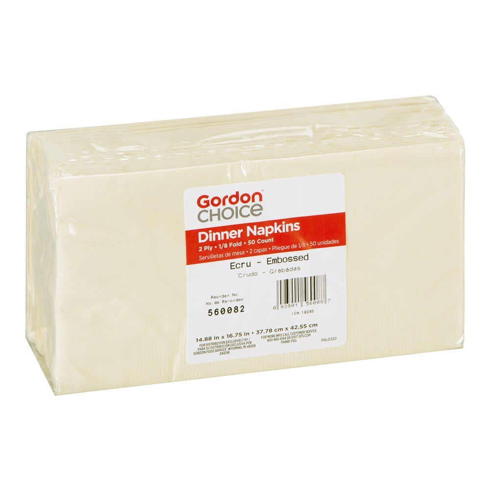 Gordon Choice 2-Ply Embossed Dinner Napkins, Ecru, 1/8 Fold, 15 x 17 Inch, Poly-Packed, 50 Ct Package, 12/Case