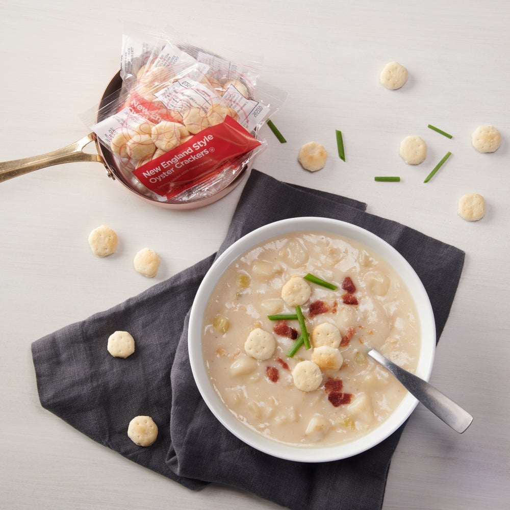 • Oyster crackers are a natural accompaniment to hot soup. Offer them to your guests with soup, chili or salads. Place them next to the soup tureen in the deli or buffet line.